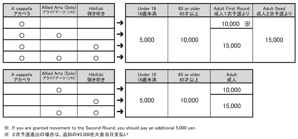 - First Round of A Cappella category Adult and Hikifuki and/or Solo division of Allied Arts category: 15,000 yen
